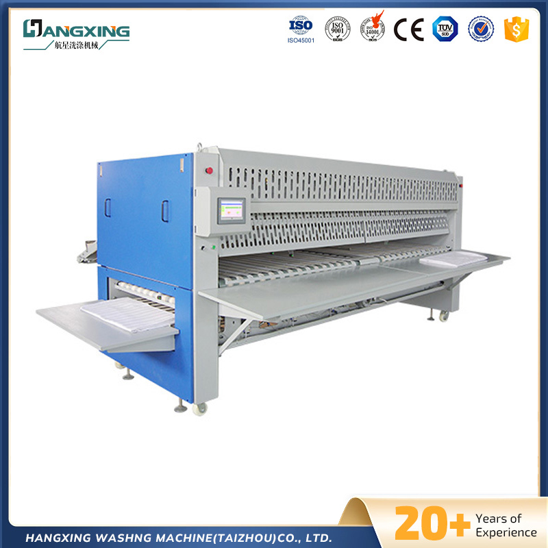 Använda: De ZD-3000 Automatisk vikningsmaskin är lämplig för att ansluta till alla typer av strykmaskiner och det är en bra tillhörande utrustning för strykmaskiner. Den kan automatiskt fälla och mata ut det platta tyget från en strykmaskin.